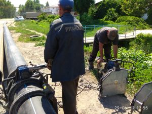 Ведутся работы на участке водовода ВНС-3 — ВНС Артемовская в районе пересечения улиц Тимирязева и 4-й Железнодорожной. Подготавливается 130-метровая «плеть» из пластиковой трубы, которая будет уложена под железнодорожным полотном методом релайнинга (протаскивание трубы из полимерных материалов внутри старой металлической трубы).