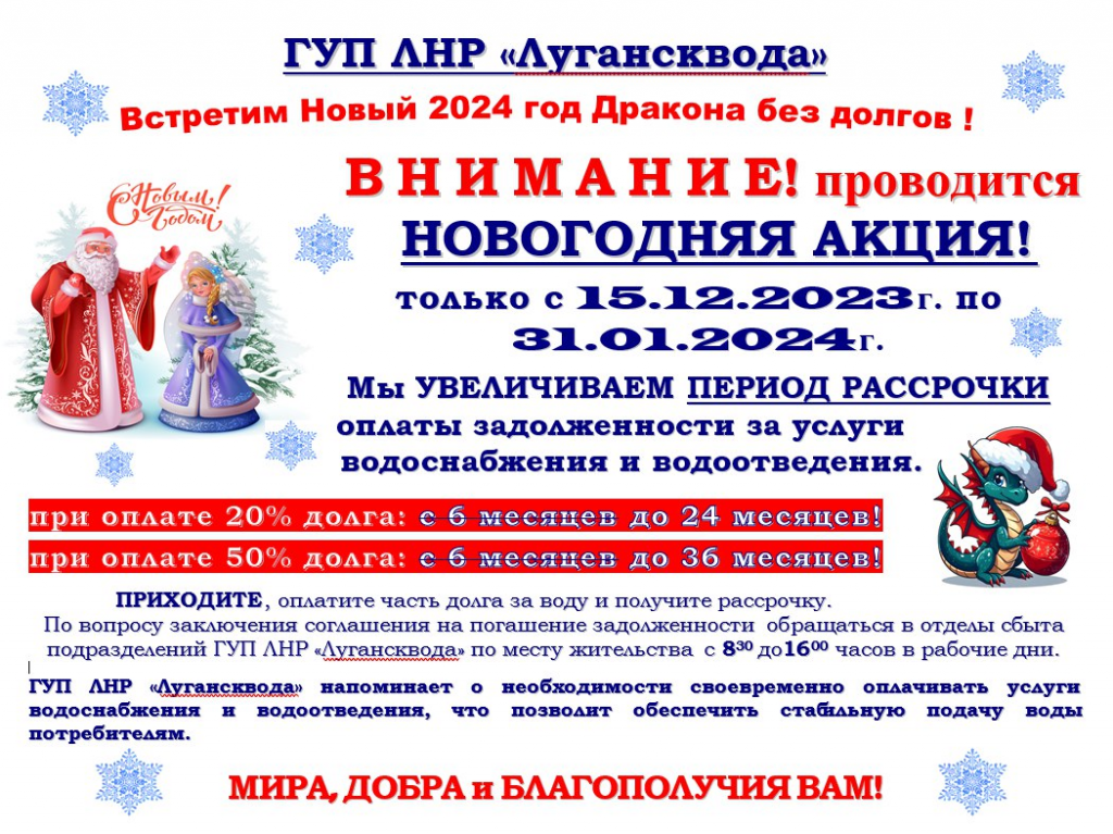 НОВОГОДНЯЯ АКЦИЯ! Запись опубликована:25.12.2023 Рубрика записи:Новостной блок / Полезная информация Вам также может понравиться Информация для жителей города Ровеньки 30.05.2022 Информация для жителей Республики! 14.11.2025 Из-за аварии на водоводе прекращено водоснабжение ряда кварталов и улиц Луганска 01.08.2019